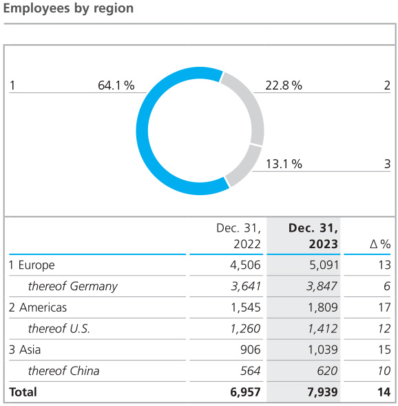 There were only minor shifts in the regional structure in 2023 compared to the previous year. With 5,091 people (previous year: 4,506), the European Group companies continued to account for by far the largest share of the workforce. 3,847 employees (previous year: 3,641) were employed in Germany at the end of the year, most of them at the largest production and development sites of the ECKART and BYK divisions, in Hartenstein and Wesel respectively. The inclusion of the Von Roll companies augmented the number of employees in Switzerland by 213. The workforce in the Americas rose by 264 to 1,809 at the end of 2023 (previous year: 1,545). The increase was primarily attributable to the Von Roll Group’s North American and Brazilian companies. The number of employees working for the Asian Group companies grew from 906 in the previous year to 1,039 in 2023, with the headcount in China and India increasing the most due to the new Von Roll companies.