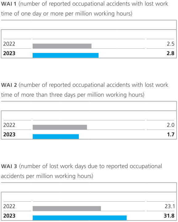 For 2023, ALTANA again set ambitious target ranges for all three accident indicators (WAI 1: 0 to 2.3; WAI 2: 0 to 1.5; and WAI 3: 0 to 27.0), once again emphasizing how important the continuous improvement of occupational safety is for the company. However, the year presented a challenging economic environment, characterized by geopolitical conflicts and cyclical declines in demand in the three major economic regions of Europe, the U.S., and China. Against the backdrop of these general conditions, the number of behavior-based accidents rose. Although we succeeded in keeping the number of reported occupational accidents at our sites at a low level, we were unable to achieve our ambitious targets at Group level in 2023, as was the case in 2022. Globally, 31 accidents with lost days were reported at ALTANA, two more than in the previous year. Based on hours worked, the WAI values are as follows: WAI 1: 2.8 (previous year: 2.5); WAI 2: 1.7 (previous year: 2.0); and WAI 3: 31.8 (previous year: 23.1).