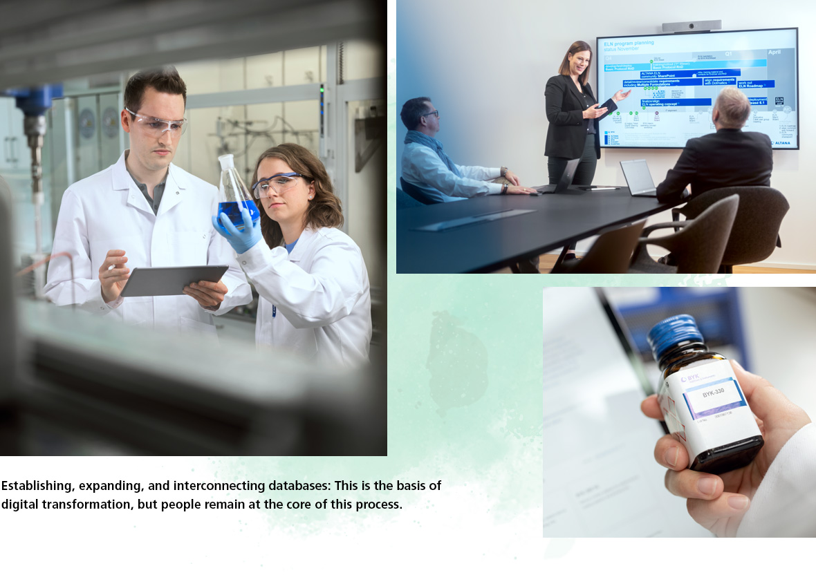 INNOVATIVE STRENGTH ALSO BENEFITS from digital knowledge management. We are striving to digitally make our decades of research results accessible across all divisions. The meticulous preparation of high-quality data is a time-intensive process, but it lays the foundation for offering our customers even better and faster product innovations and services.” In a broader context, ALTANA is committed to progressively building, expanding, and interconnecting databases. Yet, for Axel Vogelbruch, this is just the starting point: “To fully unlock the potential of digital transformation, we must reshape our work methodologies. The central element is, and remains, people.”